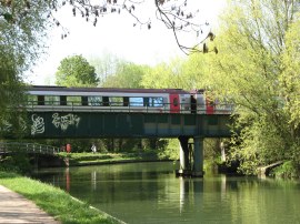 Just below the boat houses the river Cherwell joins the Thames, adding yet more water to the ever growing river which now contained some quite large pleasure boats, photo 25, this was one was the Wargrave. This section of path was also busy with cyclists hurrying by, which we both found a bit disconcerting as they did tend to fly up very quickly and quietly. With us both often stopping and stepping either backwards or forwards on the path to take photographs it was a recipe for an accident and was the same problem I had faced when walking up the Paddinton Arm of the Grand Union Canal a couple of months earlier. Reaching a slight bend in the river we passed a small boat house and then crossed two small bridges over the entrance to the Weirs Mill Stream before heading under the B4495 road bridge. The river is now running alongside Iffley Meadows which are a series of alluvial flood meadows which are still managed traditionally as hay meadow and permanent pasture. The path passes the Isis Tavern which was packed with customers, and seemed to be the destination for a large number of the cyclists, before heading on Iffley Lock, photo 26. Below the lcok the numbers of people on the path started to drop as we continued dwnstream passing under the A423 road bridge and then the metal arches of the Kennington rail bridge, photo 27, which carries the freight railway branch line that serves the BMW Mini factory at Cowley.