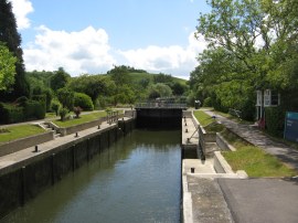 At first the route runs over an area of rough ground before joining a path which runs alongside a succession of fields. The path heads under the Appleford Railway Bridge, photo 13, before following the Thames as it curves round past the weir over the entrance to the old channel and down the Clifton Cut, photo 14, which runs for about a mile down to Clifton Lock, photo 15, where we stopped for our lunch on a conveniently sited bench.
