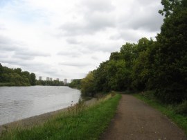 Once under the bridge the path heads by more housing and past the old Harrods Furniture Depository, photo 31, now converted into flats, a place I always remember as a landmark for the Oxford - Cambridge boat race. The Thames then curves round the edge of the Wetland Centre at Barnes although this remains hidden from view. While we were on this stretch of path we came across a family who were holding a large terrapin that they had found besides the path. I had visions of it having spent all summer breaking out of the wetlands centre only to be caught a few feet away from the river and freedom although it easily could have been a native of the river. Another tree lined section of path, photo 32, follows the river down towards Putney, passing by Craven Cottage, photo 33, home of Fulham FC on the opposite bank. The path heads alongside some playing fields and crosses over the mouth of Beverley Brook before joining the Embankment.