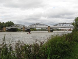 The path heads alongside Kew Gardens, and approaching Kew Palace, passes the entrance to the Grand Union Canal heading off from the opposite bank, photo 22. Next up the Thames reach Kew Bridge, photo 23, and having passed under the bridge we stopped for our lunch break on a bench by Kew Pier, not the most scenic location but it was good to have a sit down for a rest and something to eat. After lunch we headed on and soon passed under Kew Railway Bridge, photo 24, which carries both rail services and the District Line trains over the river.
