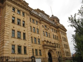 The towpath then heads by the buildings of the National Archive and a succession of modern riverside housing developments along another tree lined section of path which is followed most of the way down to Chiswick Bridge, photo 25. The route then heads along Thames Bank, past a number of large houses and the Ship Pub to reach the Stag Brewery at Mortlake, photo 26. We had been watching the incoming tide filling up the river and reaching the end of the brewery buildings we reached a small inlet, photo 27, where the water was across a low lying section of towpath, photo 27. I had my walking boots on and was able to make my way across but Sara's boots weren't waterproof so I retraced my steps, one boot getting a bit damp on the return journey, and we followed the signposted diversion up along a short section of Mortlake High Street before heading back down to the rejoin the waterside on a slightly higher section of path a little way down river.