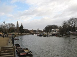 Here the route heads away from the river, a short distance up Ferry Road, before turning right along Manor Road. This is followed into Twickenham Road and then becomes Strawberry Vale photo 4 as the road is followed for some distance down towards Twickenham. The river remains hidden behind houses with only a short diversion through Radnor Gardens giving views across the Thames, photo 5. Leaving the gardens the route continues along the road, now called Cross Deep which is followed up to King Street in the centre of Twickenham. Here the route heads right and then soon right again down Wharf Lane which leads to the Embankment and a stretch of waterfront path running alongside Eel Pie Island, photo 6.