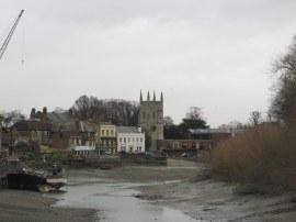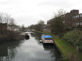 The path climbs up besides the lock and then heads to the left across the canal, following Dock Road between the boatyards up to Brentford High Street. It was low tide only the waters of the river Brent flowing out to the Thames in the bottom of the channel below the lock, photo 22. Unfortunately disaster struck as Sara tripped over a low chain fence lining the road and fell, breaking her camera which she had out to take a photo. Luckily Sara herself escaped with a cut knee and bruising and was able to continue the walk, for a split second I had envisaged much worse consequences as it was quite a tumble. The route heads just a few yards along the High Street before once again turning to the right along a path that leads back down to the Thames again, running alongside the other side of the boatyard passed on Dock Road. Reaching the mouth of the Canal / River Brent, photo 23, the route heads round a small dock from where there were views over to Lot's Ait, photo 24; the channel between the island and blank completely empty of water. Leaving the small dock the path heads then along Goat Wharf back up to the High Street once again.