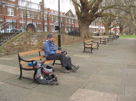 As with previously, the High Street is only followed for a very short distance before the route heads back down the river besides an office to join a paved section of path running opposite Brentford Ait. This soon leads into narrow Watermans Park, photo 25. Reaching the end of the park the route briefly rejoins the road before joining a waterfront path that is followed up to Kew Bridge, photo 26. Once under the bridge the path reaches a small area of gardens with a few benches where we stopped for our lunch break, photo 27. This spot was opposite Kew Pier which is where we had stopped for our lunch while walking along the South bank.