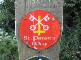 Passing Tillingham bowls club the route continues ahead between fields. Reaching a road it continues ahead towards the village of St Lawrence. Where the road turns to the right the route continues ahead into a field where it follows the left hand field edge under the power lines coming from the nuclear power plant, the footpath heading in the general direction of the water tower at St Lawrence which can be seen ahead on the horizon, photo 19. Reaching the driveway of a house the route then headed across another large open field which had been ploughed quite deeply, photo 20, and there was no footpath visible which made walking across it quite difficult on the hard and very uneven surface. Also by the house there was a rather noisy Alsatian dog running loose. Leaving the ploughed field the route heads along the right edge of another field until level with the water tower where it heads straight across the field to reach a road. The field was once again planted with a crop that had the clover like leaves although the flowers, although purple, didn't seem to be clover. Reaching the Southminster Road I turned right, leaving the route of St Peters Way, photo 21, as I started making my way down towards St Lawrence Bay.
