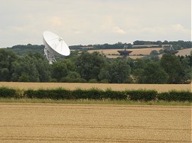 For the second time today my luck was to be in as despite there still being a red flag flying when I took photo 19, looking along the footpath that led to the firing range, by the time I reached the range which is located by the tall trees on the horizon, the red flag had been lowered, indicating it was safe to cross. There was nobody in the small guard hut at the entrance to the range, although there was some interesting graffiti, and as I went through the metal gate onto the range I could see that everybody was in the process of packing up. It was just before 2:00pm and I wondered if that was the designated finish time for Sundays. Anyway, it was a real bonus not having to detour round site and I was pleased that I had not arrived 5 or so minutes earlier. Once over the firing range, photo 20, I joined another field edge path that runs down to join the B1046 Barton Road, passing through another small nature reserve on the way. This section of the road had a footpath besides it so it was an easy walk along the road to the village of Comberton. Reaching a mini roundabout the Harcamlow Way takes a road on the left that soon becomes a hedge lined byway, once again heading between fields. Ahead of me was the telescope that I had been seeing all day, along with a couple of other smaller telescopes, photo 21, which form part of the Mullard Radio Astronomy Observatory at Lord's Bridge.