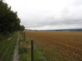 The North Downs Way heads across the A251 besides St Christopher's church and heads down the Wye Road, passing the war memorial, photo 13, on the village green. Reaching the end of the green the route continues ahead along the Pilgrims Way. Initially there are houses on the right before the road leaves the edge of the village. Just past Brewhouse Lane the path reaches the point where the route of the North Downs Way splits into two, photo 14. One branch heading off towards Dover via Canterbury, the other branch heading towards Dover via Folkestone. Apart from the small standard signpost there was nothing else to mark the significance of the spot in the rather gloomy lane. Here I headed down the branch towards Folkestone, primarily because between Etchinghill and Dover the North Downs Way shares its route with that of the Saxon Shore Way which I have already walked in the other direction. A little further down the road the route of the North Downs Way takes a footpath off to the left which runs along side the edge of a field, turning left and then right to take a footpath that runs across the middle of the field, photo 15, down to cross the A 28. Heading over the field I could see the tower of Wye church and, on the hillside above the town, the Wye crown which I would be passing above on the next stage of the North Downs Way as the route once again joins a path that runs along the top of the hills.