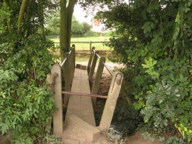 Reaching a house, the Roach Valley Way then bears half right across the middle of the next field along a path that leads up to reach the church, photo 16. The route then heads through the churchyard before continuing on along the small High Street. At a road junction the route continues on, passing a handily located shop, before heading to the left down Gays Lane. This heads out past a few houses to reach a large field where I joined a field edge path that starts descending down towards the River Crouch, photo 17. Having headed along the edge of the first field the route of the Roach Valley Way is shown on the map as curving round to the left towards the farm buildings at Upper Raypitts Farm however on the ground the path continued straight ahead towards a stile and over a rather rickety wooden bridge, photo 18, taking a direct line down to the flood bank lining the River Crouch.