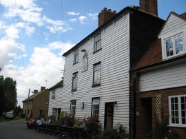 Reaching the end of the field the route heads to the right into Hockley Woods and I was a little uncertain of the route here. First I turned sharp right along a path that led back, parallel to the way I had come, close to the top edge of the field. However on the map the route is shown as running a little lower down so I retraced my steps and headed a bit further into the woods before turning to the right along a very minor track heading through the trees. However at this point I did begin to think that my original choice of route had probably been the correct one, especially as I had seen a Roach Valley Walk way marker on it although at the time I had been unsure whether that had been for the path coming in the other direction from Rochford that I had just walked, which could have been just inside the trees rather than along the field edge path that I chose as it did seem a bit strange to have two sections of path so close to each other. Reaching the end of the minor path I linked up with the correct route and from then on it was comparatively easy to follow the route of the Roach Valley Way, as shown on the map, as it winds its way through the trees of Hockley Wood, photo 8, although the path wasn't that well way marked on the ground. Reaching the far side of the woods the route heads to the right along a short fence lined section of footpath in between houses on the outskirts of Hockley. Reaching the end of this footpath the route heads briefly to the left along Woodlands Road before heading to the right down Kilnwood Avenue. This is followed into Hockley Rise and reaching the end of the road the route heads to the right, passing the modern brick building of Emmanuel Church before crossing over the road by the Hawkswell village sign and heading to the left down White Hart Lane besides the White Hart Pub, photo 9, which had an attractive display of hanging baskets outside.